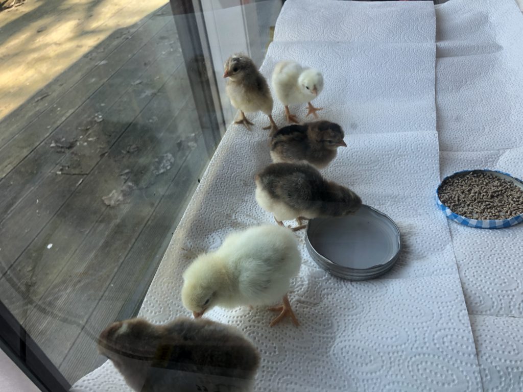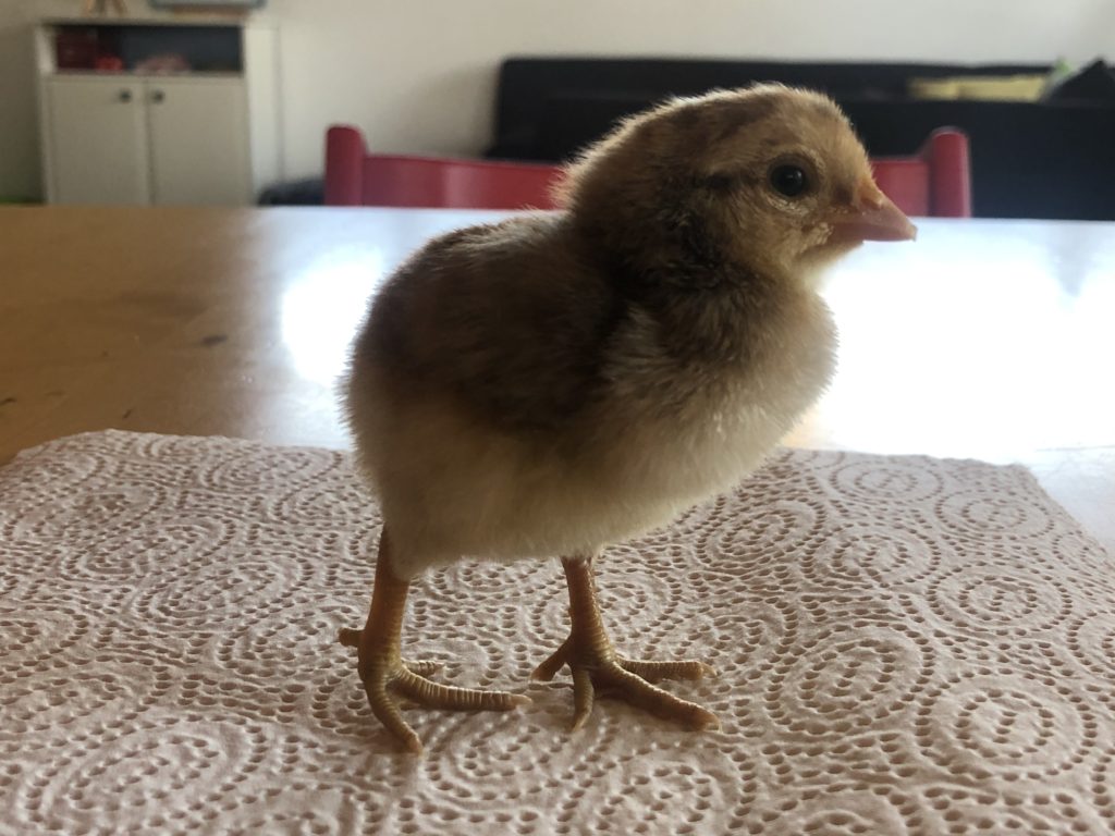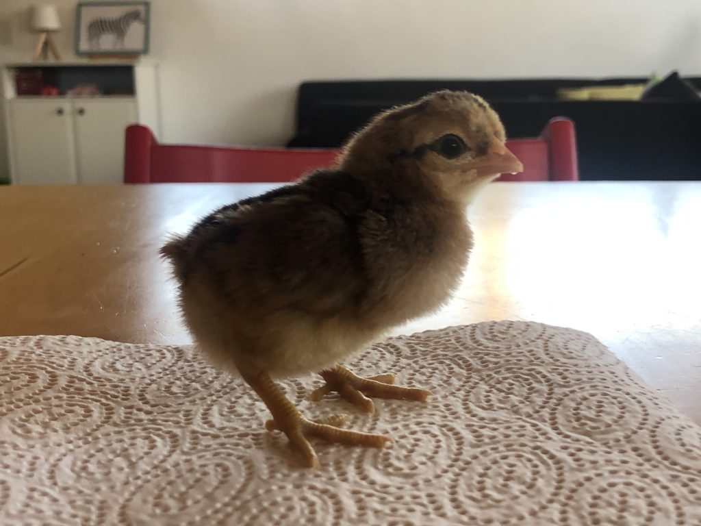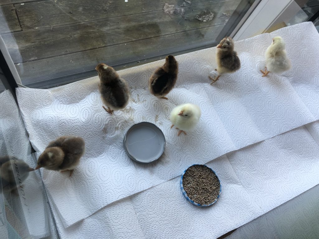 Hier ist die Rasselbande. Wer zählen kann, hat sicherlich gemerkt, dass noch zwei Nachzügler dazu gekommen sind. Diese beiden brauchten ein wenig Hilfe beim Schlüpfen und brauchten einen Tag besondere Zuwendung von uns. Wir haben also jetzt 6 muntere Küken.